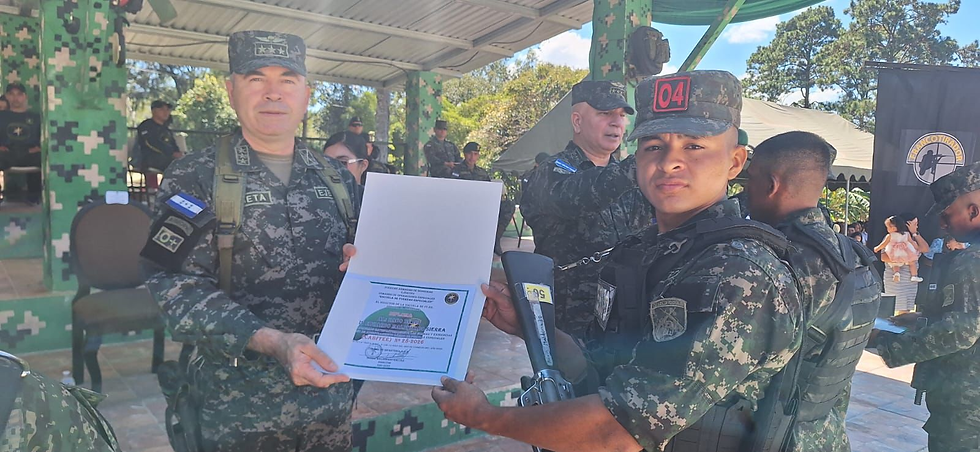 La ceremonia de clausura contó con la presencia del Jefe del Estado Mayor del Ejército, Coronel de Infantería DEM Geovany Javier Iraheta Ayala, acompañado por el comandante del Comando de Operaciones Especiales (COEs), Coronel de Infantería DEM Fabricio Daniel Cárcamo Vega, y el Coronel de Infantería DEM Roger Maldonado Gálvez, comandante del Primer Batallón de Fuerzas Especiales, quienes destacaron el alto nivel de preparación, disciplina y compromiso demostrado por los graduandos.